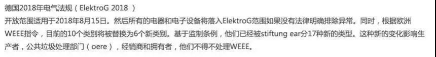 2016年德国环保部门就发布了针对电商的法律,要求亚马逊通知在其平台上销售的境外电商注册电子设备回收,而在取得WEEE电子设备回收码之前,亚马逊必须责令商家停止销售。
